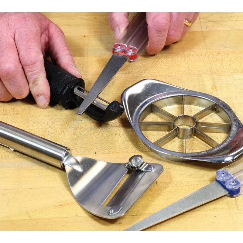 DiaFold Flat File – Der flach geformte DMT Diamantschärfstab ist ein echter Spezialist, wenn es um das Schärfen von Gartenscheren, Scheren und ähnlichen Werkzeugen geht. Aufgrund der flachen, zulaufenden Form eignet sich der Stab auch zum Entgraten an schwer zugänglichen Stellen. Der Farbcode Rot steht bei DMT für die feine 600er Körnung. Für den Einsatz des Schärfstabs wird kein Öl benötigt, denn der Stab kann problemlos mit Wasser oder trocken eingesetzt werden. Die schwenkbaren, transparenten Kunststoffgriffe sorgen in geschlossenem Zustand für den Schutz des Schärfstabs.