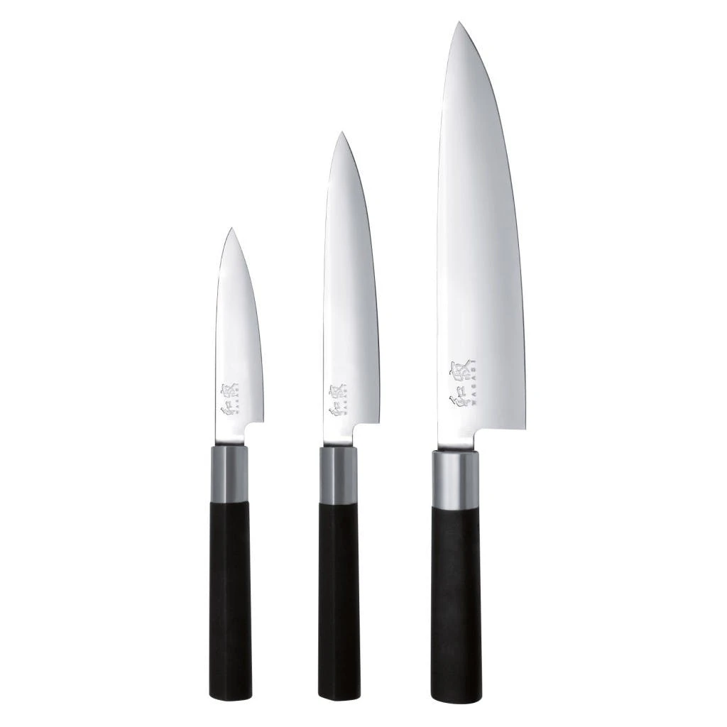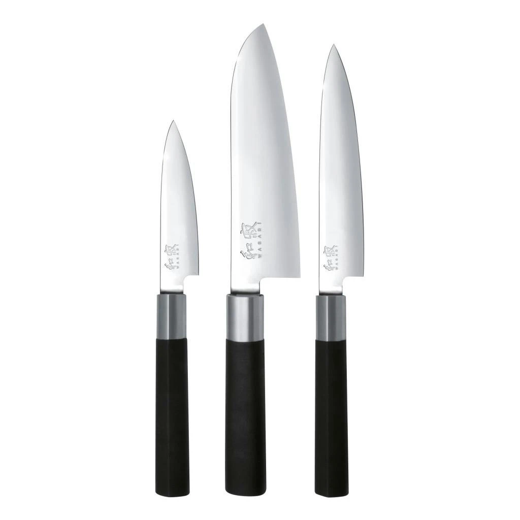 Das KAI WASABI BLACK Kochmesserset mit Santoku und zwei Allzweckmessern (67-W13) besteht aus den folgenden scharfen Küchenmessern: