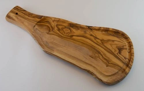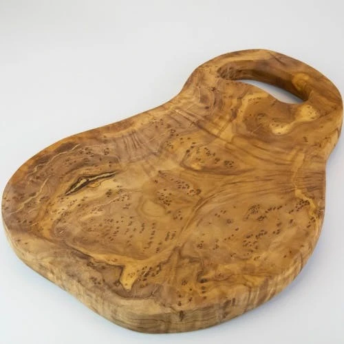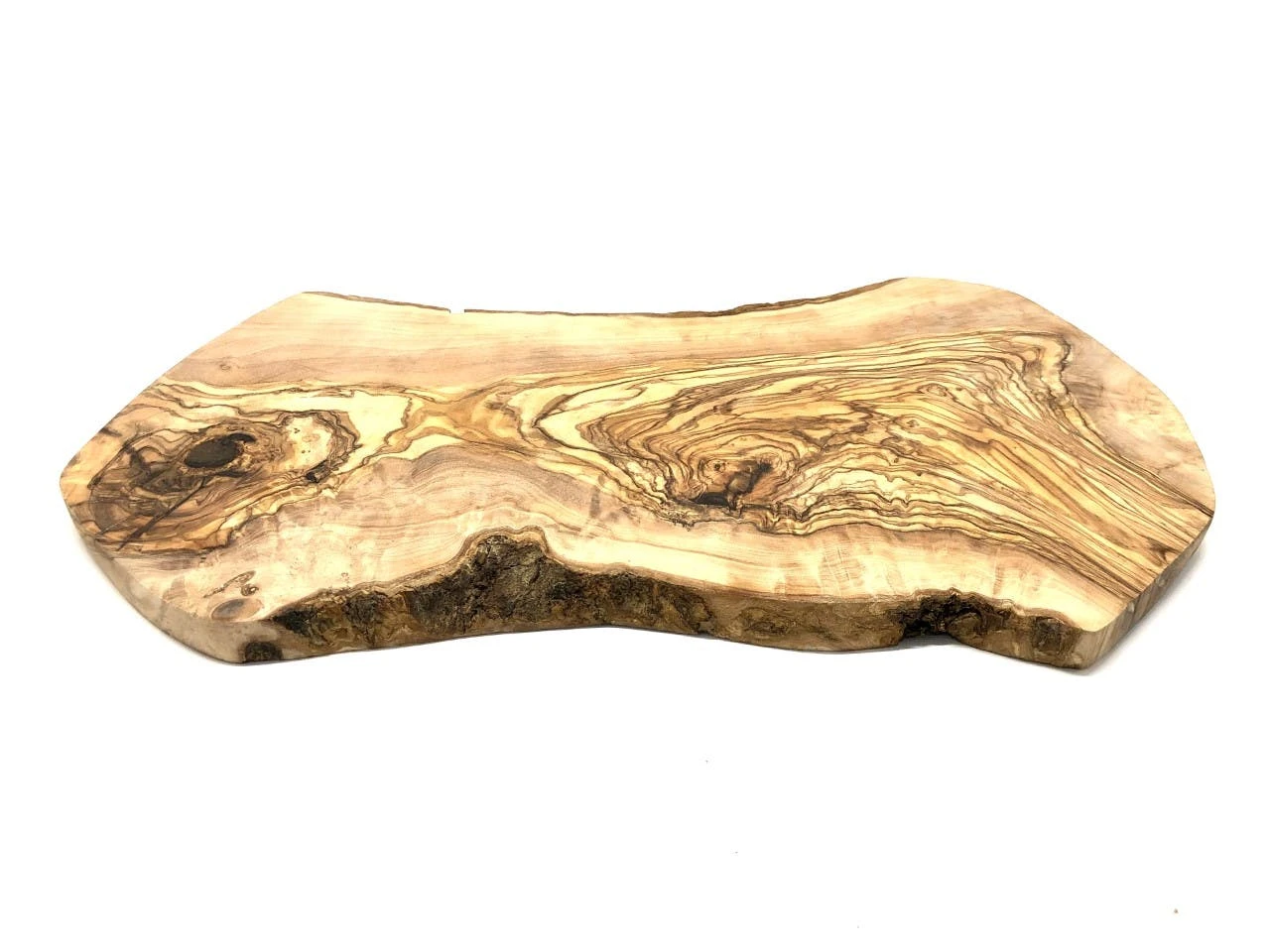 Natürlich ist dieses praktische Olivenholzbrett auch als Arbeitsbrett für die Küche sehr gut geeignet. Ein klassisches Servierbrett bei dem die natürliche Wuchsform des Olivenbaumes maßgeblich ist für die individuelle Formgebung.