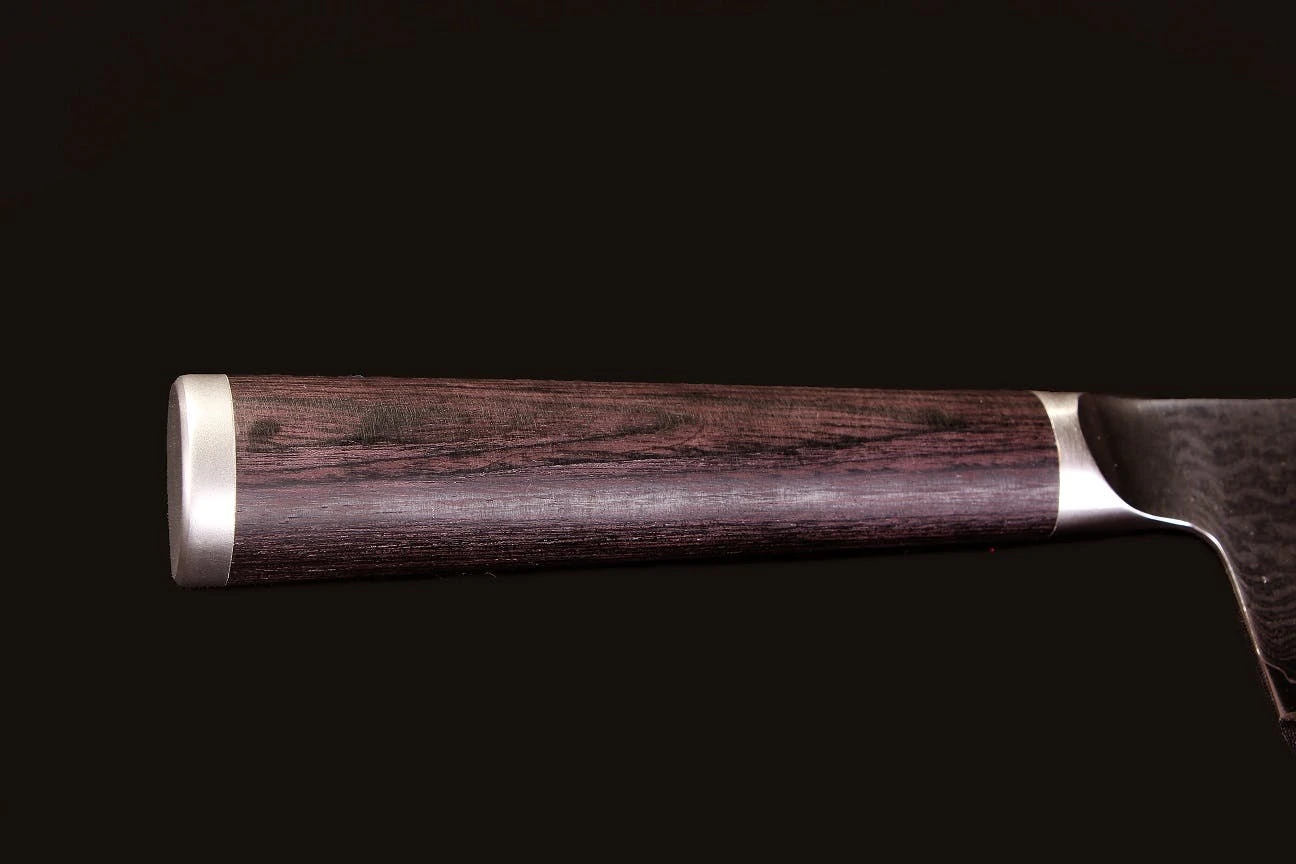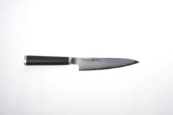 Allzweckmesser Klingenlänge: 13 cm, Schneidlage: AUS8 Stahl, 33 Lagen Damaszener Stahl, Grifflänge: 11,8 cm, Klingenhöhe am Griff: 3 cm, Gewicht: 80 g, Klingenhärte: 61 HRC, Schliff: beidseitig, Ergonomisch geformter Handgriff aus Schichtholz Pakka, Handgefertigt in Seki Japan, Das Messer wird in einer hochwertigen Geschenkverpackung geliefert.